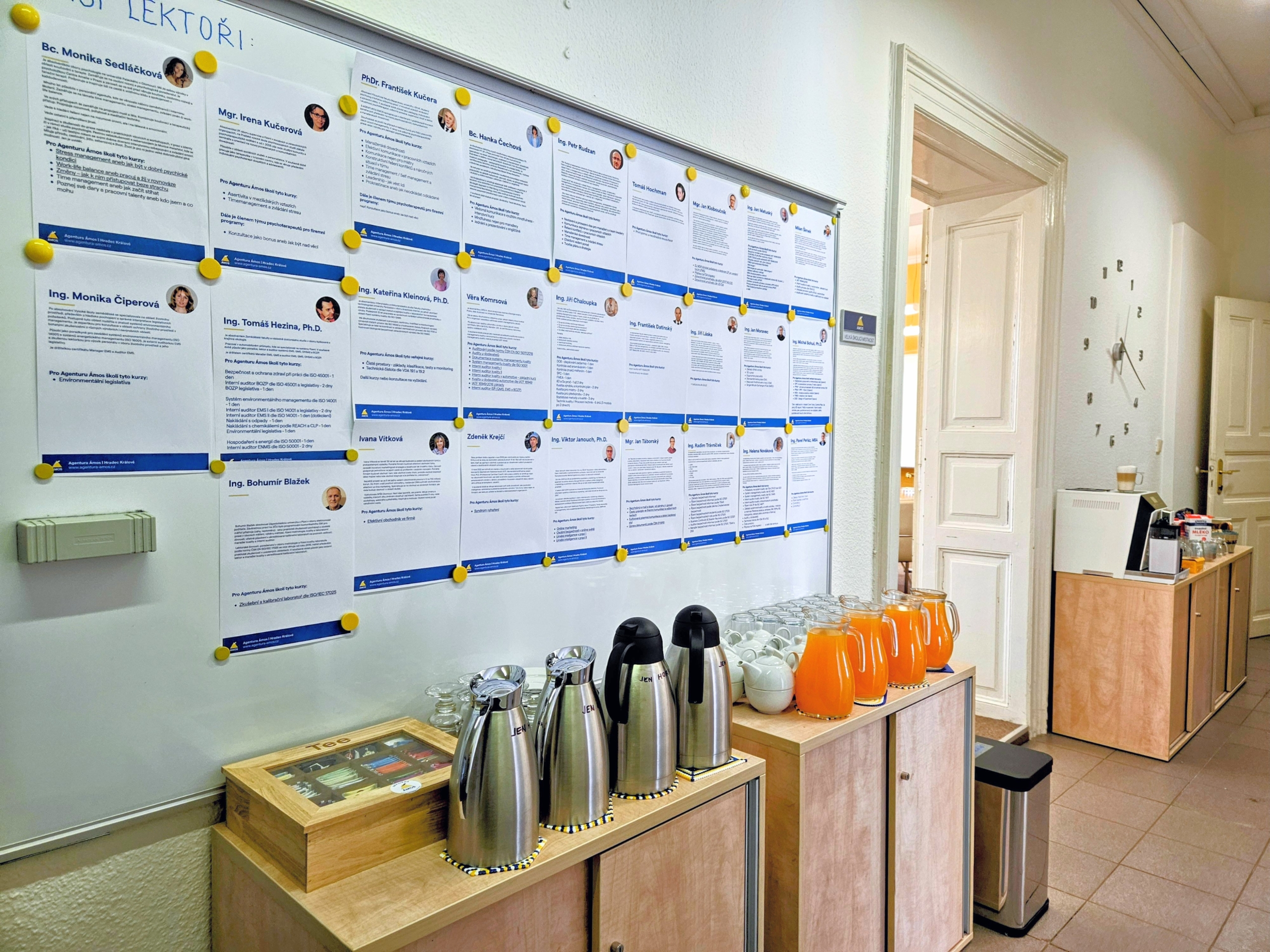 Během našich veřejných kurzů se postaráme i o vaše pohodlí. Hlady u nás trpět nebudete! Zajistíme, abyste měli k dispozici dostatek ovoce, zeleniny, kvalitní kávu, čaje a různé pochoutky. Víme, že čas strávený na školení musíte pak v práci dohnat, proto se postaráme, aby vaše zkušenost s Agenturou Ámos byla co nejpříjemnější. Osobní přístup je pro nás klíčový!